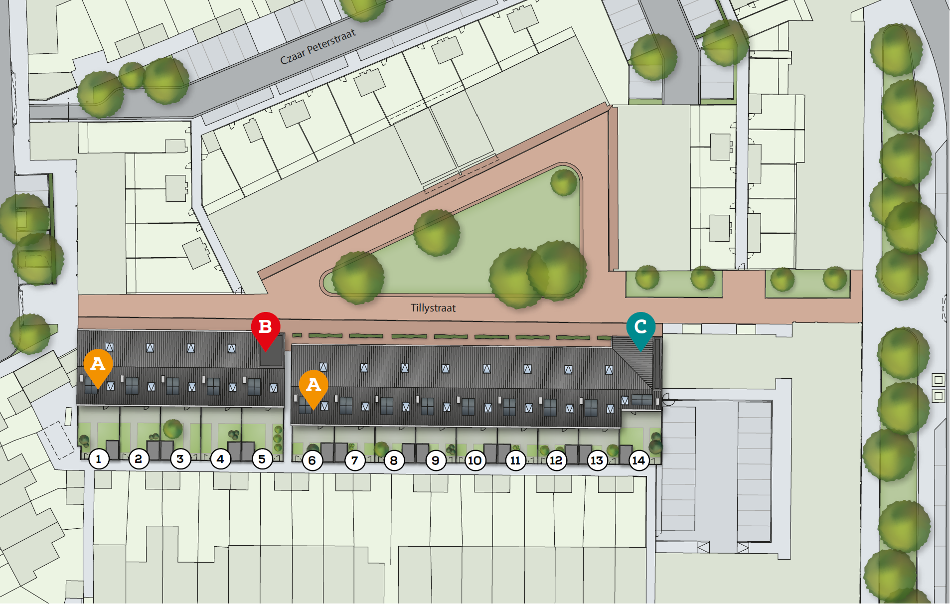 Onze nieuwe woningen bevinden zich in de Tillystraat. In de Tillystraat zijn in het jaar 2020 een aantal woningen gebouwd, op dit moment zijn wij bezig met de bouw van 14 hofwoningen aan de andere kant van de straat. Dit zijn midden-huurwoningen geschikt voor één- en tweepersoons huishoudens. Voor jong en oud.